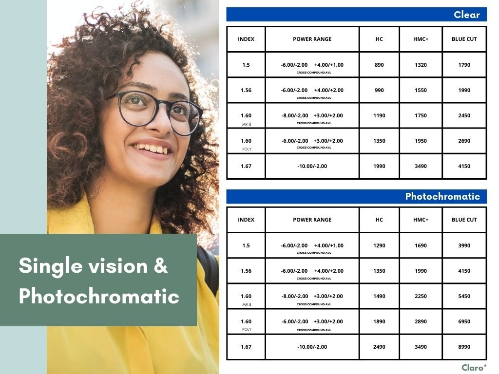 Category of lenses with their respective prices.